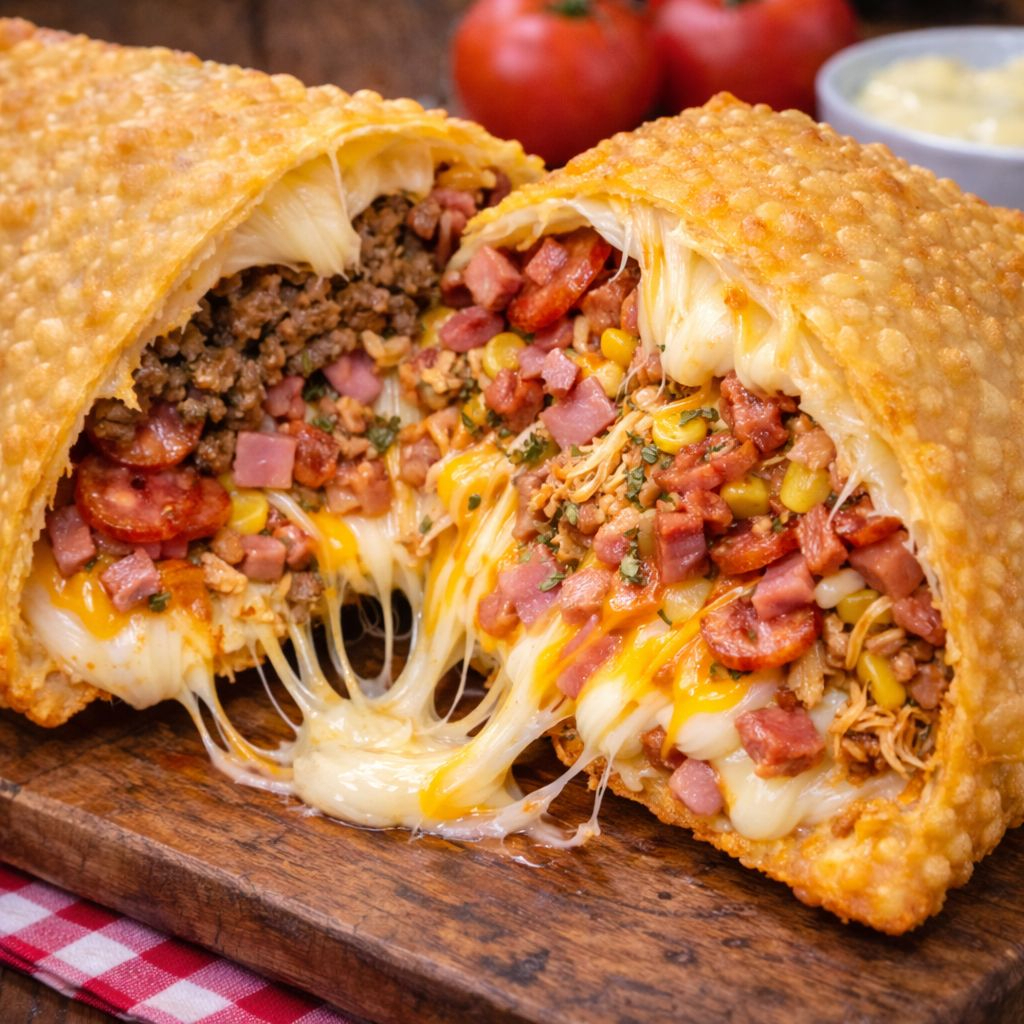 Delicioso pastel crocante, frito na hora, recheado com carne, queijo e catupiry. Preparado com ingredientes frescos e massa leve e dourada, garantindo muito sabor em cada mordida.