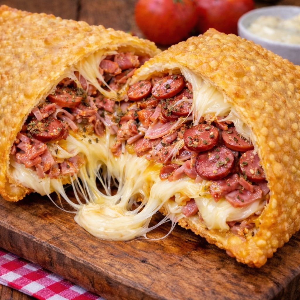 me ajudar a criar uma descriçao para meu pastel de pizza que leva queijo presunto oregano e calabresa
