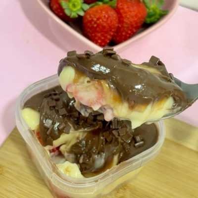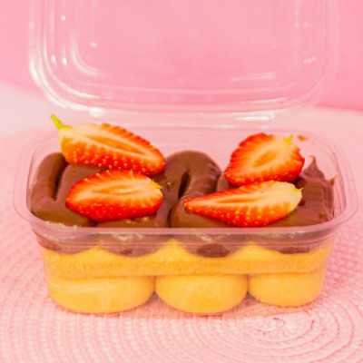Camada de creme de ninho, biscoito champanhe original, camada de creme de chocolate, finalizado com morangos frescos. Em média 240g. Em média 240g.
