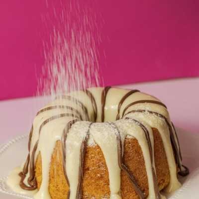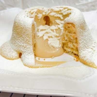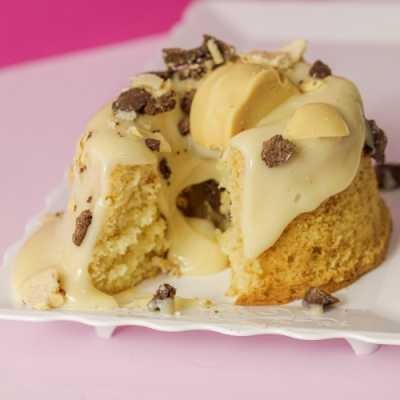 Bolo branco extremamente fofinho, intercalado com pedaços do mais puro chocolate branco. Cobertura cremosa de leite Ninho, finalizado com pedaços de Ouro Branco, que conferem um toque crocante e uma explosão de sabor. Ainda chega quentinho para você. Aproximadamente: 220g
