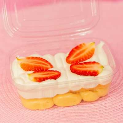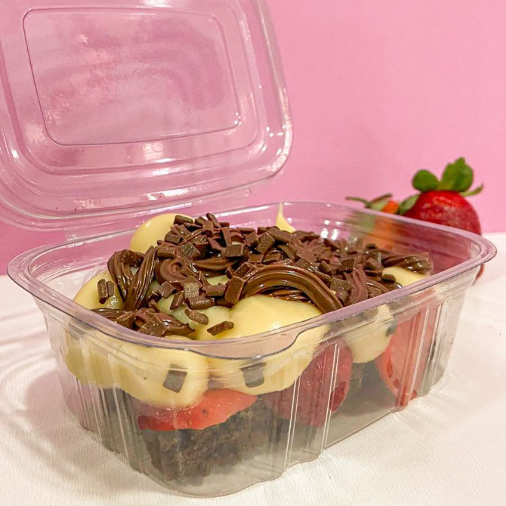 Camada de creme de ninho, biscoito champanhe, camada de mousse de ninho, finalizado com morangos frescos. Em média 240g.