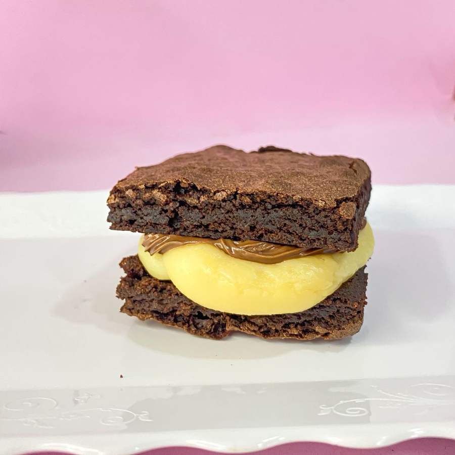Uma novidade de dar água na boca. Pedaços do nosso adorado Brownie, tornado ainda mais delicioso com um generoso recheio extremamente cremoso de Ninho ou brigadeiro, finalizado com Nutella purinha e morangos. Não hesite, peça já o seu e delicie-se com esta explosão de sabores!