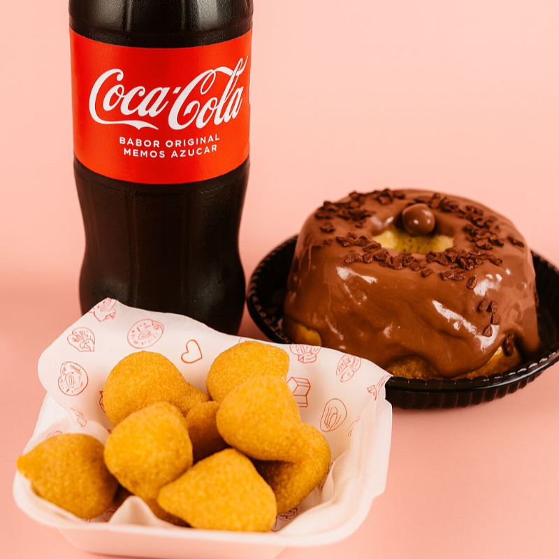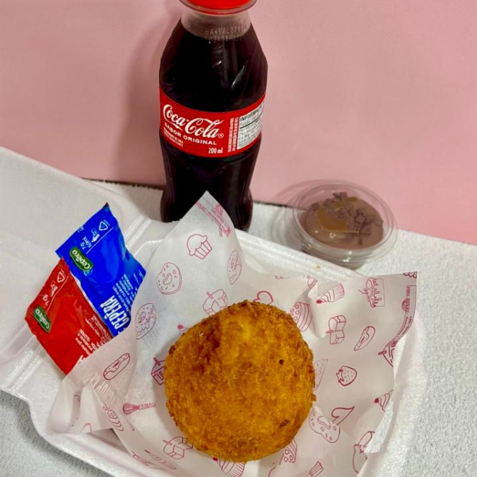 Olha esse combo delicia. Uma coxinha deliciosa e super crocante, uma mini porção de brigadeiro e coca cola 200ml Grátis. Uma combinação para matar a vontade de um salgado e um doce.