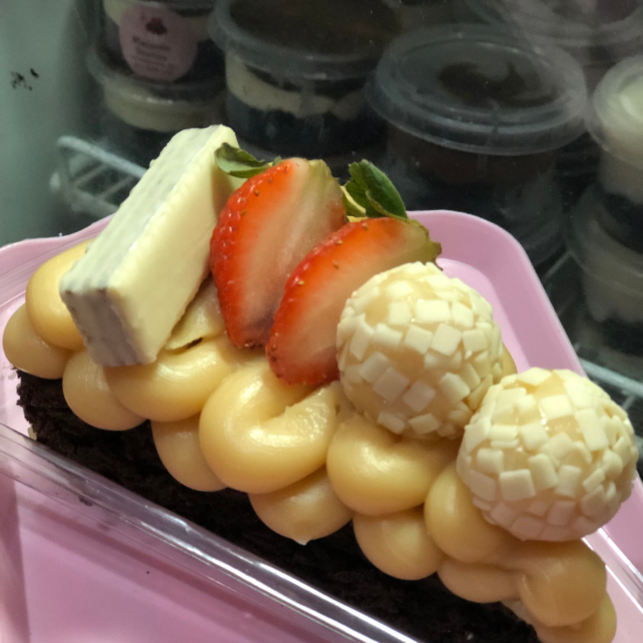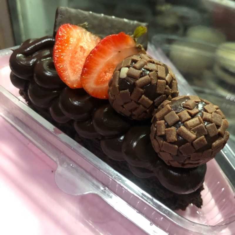 brawnie , recheio cremosos de chocolate finalizados com brigadeiros e morango