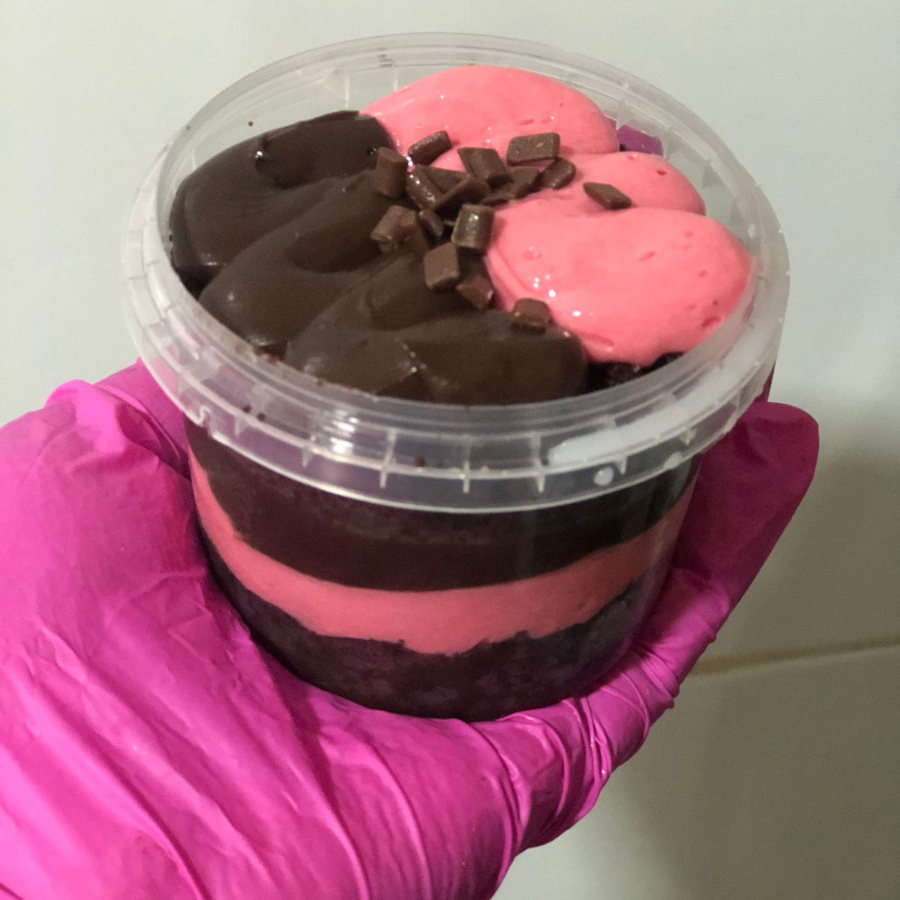 Massa molhadinha , mousse de morango e creme de chocolate cremoso Aprox 180g