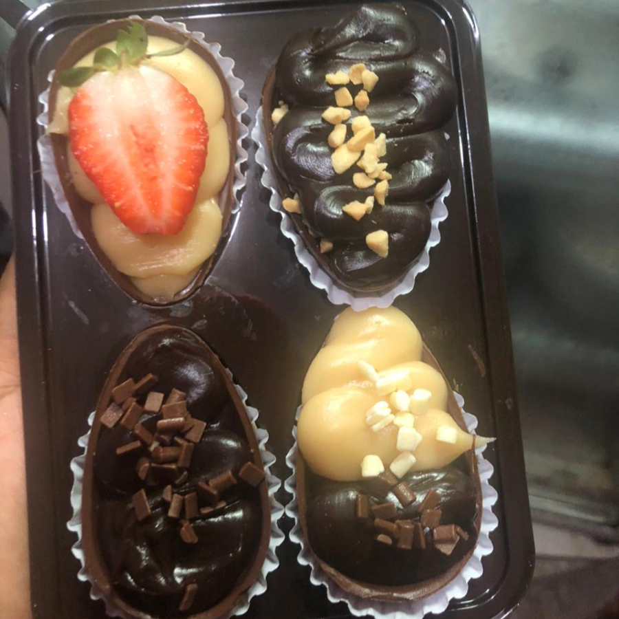 Casca chocolate bled , 4 minis ovos (1 morango , 1 Ferrero , 1 brigadeiro tradicional,1 duo)