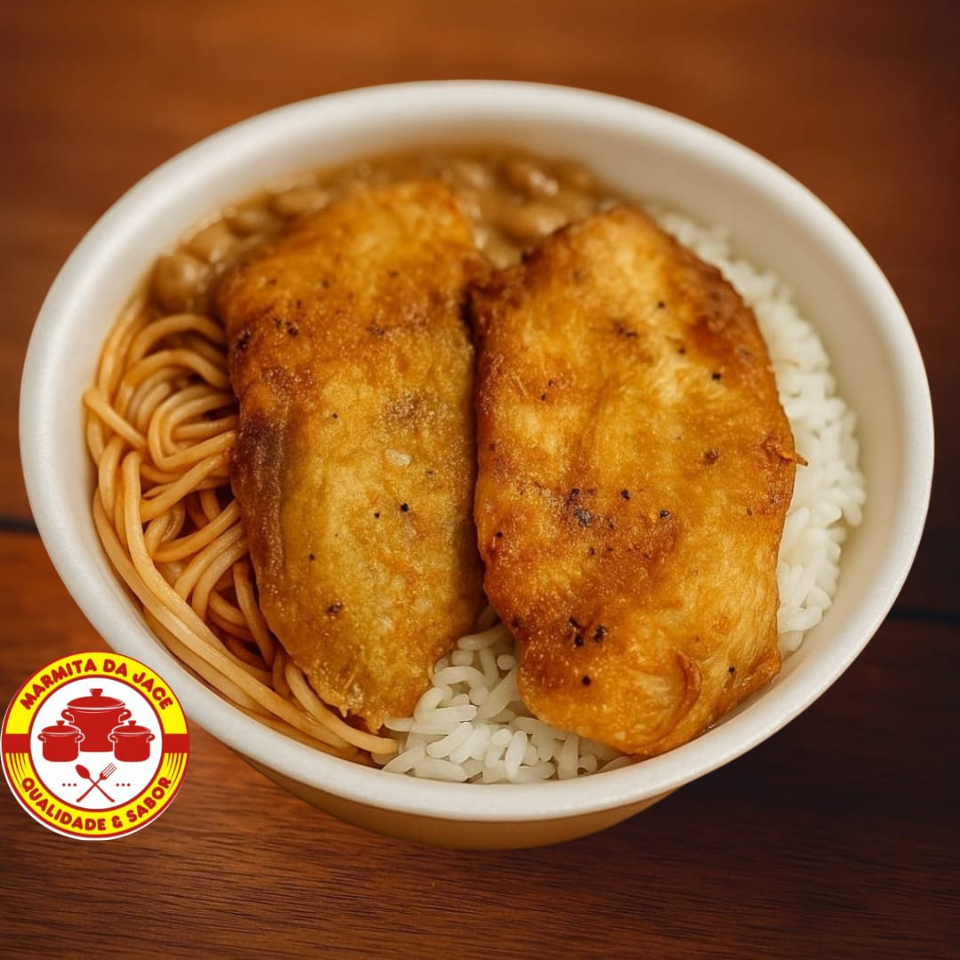 Desfrute de uma generosa marmita de 600gr, estrelada por um suculento e crocante filé de frango à milanesa, acompanhado de batatas fritas fresquinhas e crocantes, preparadas na hora só para você. Acompanha, ainda, três opções de acompanhamentos à sua escolha para completar essa refeição saborosa e completa. A composição da sua marmita inclui 130g de proteínas de alta qualidade, 200g de um delicioso feijão carioca de caldo rico e saboroso, 220gr de arroz branco soltinho e 80gr de batatas fritas douradas e crocantes. Ideal para um almoço saboroso e nutritivo. -------------------------------------------------------------------------------------------------------------- Marmita - comida - Omelete - Queijo - frete - cozinha rápida - Desconto - Ofertas - Bom e barato - Combo -Frango - Carne - Massas - Italiana - Brasileira - Delivery - Caseira - Almoço -Feijão - Saladas - Churrasco - Parmegiana - Bisteca - Linguiça -doces e bolos - saudável - promo -promoção