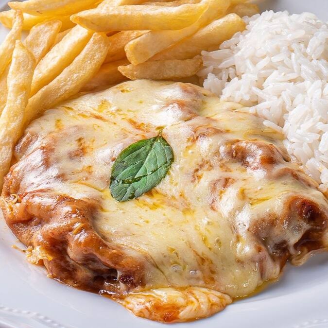 Filé de Frango suculento, temperado e empanado, recheado com queijo e Bastante molho de Tomate Artesanal.