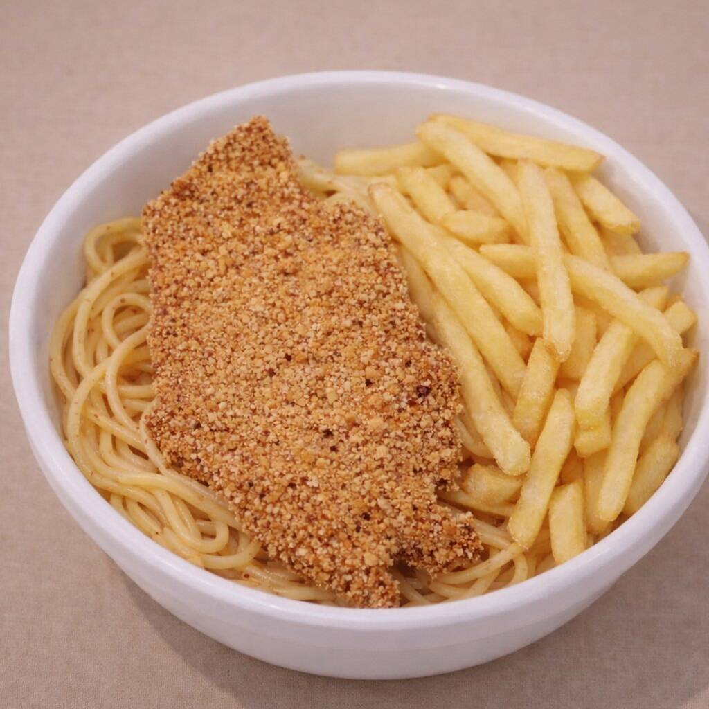 Espaguete alho e óleo, filé de frango Empanado e batata frita