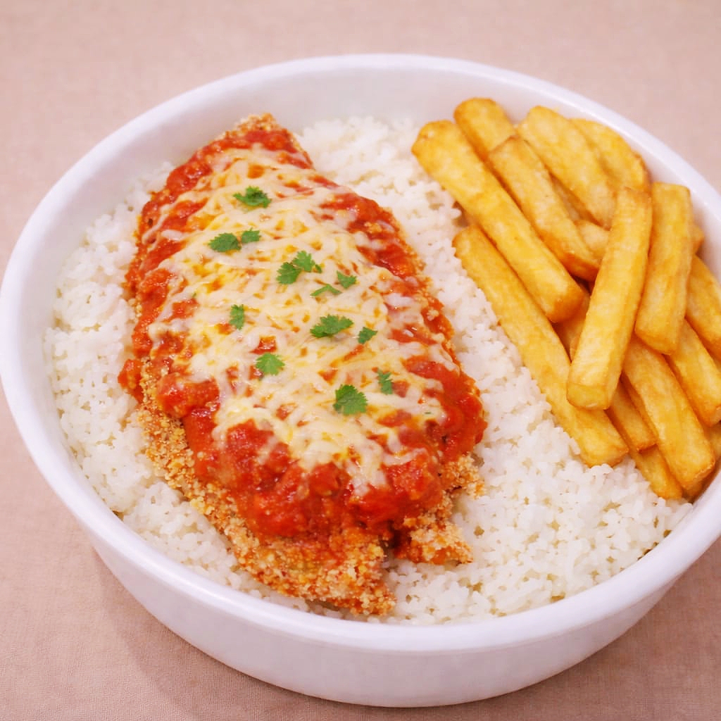 Arroz, filé de frango a parmegiana e batata frita