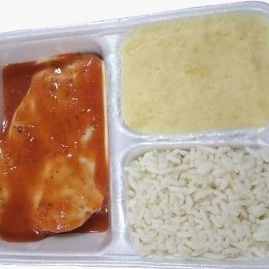 Marmita com delicioso filé de frango parmegiana (empanado na massa crocante coberto com molho de tomates e queijo) acompanhado de arroz branco e purê de batatas inglesas mais uma Coca-Cola lata de 350ml.