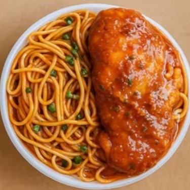 Marmita com Delicioso filé de Frango á parmegiana (empanado na massa crocante, coberto com molho de tomates e queijo mussarela) acompanhado de macarrão espaguete suculento al dente. (Marmita Indicada Para 01 Pessoa)