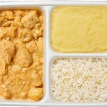 Marmita Executiva de strogonoff acompanhado de arroz branco e purê de batatas inglesas.