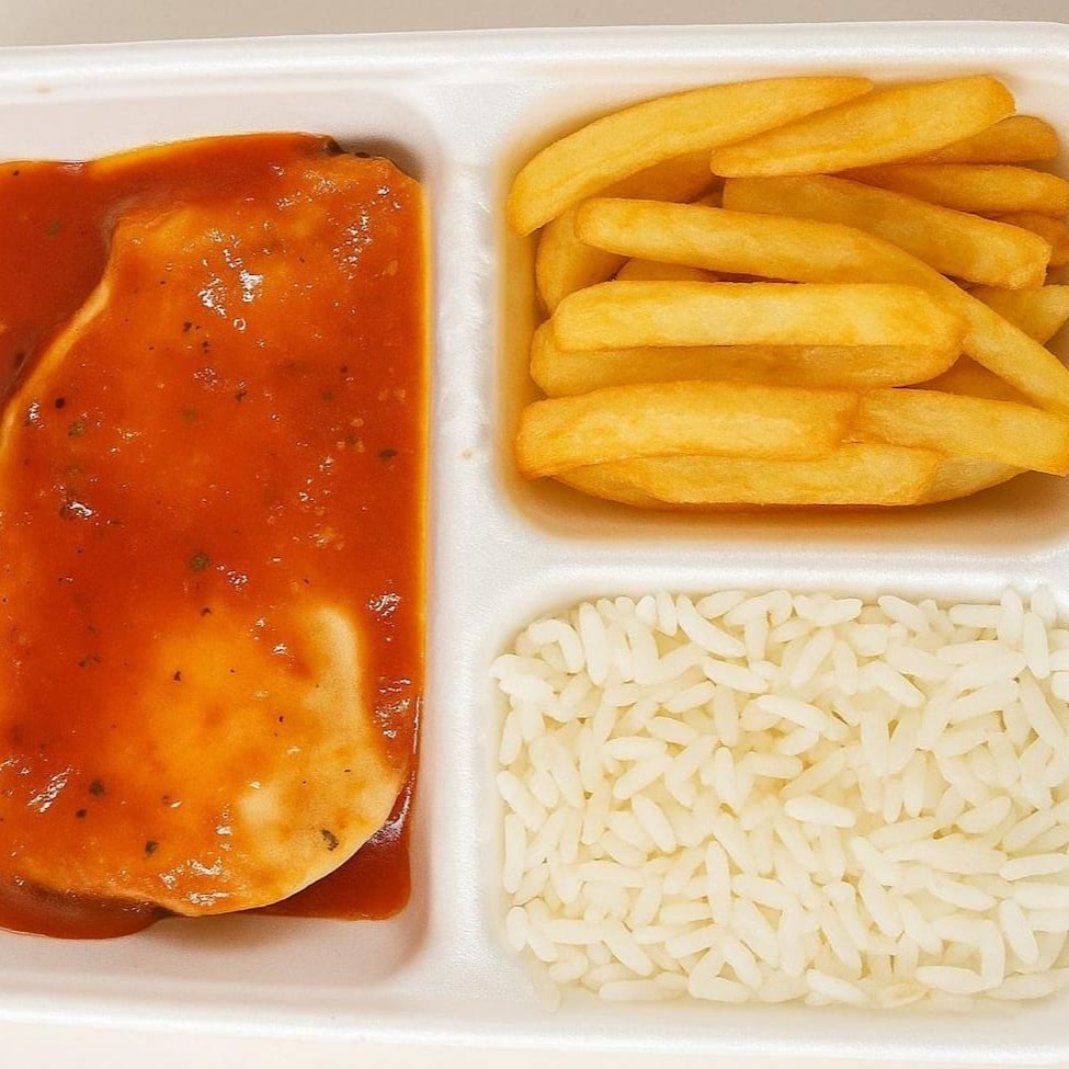 Marmita Executiva com delicioso filé de frango parmegiana (empanado na massa crocante coberto com molho de tomates e queijo) acompanhado de arroz branco e batatas fritas Gratis. Marmita indicada para 01 pessoa.