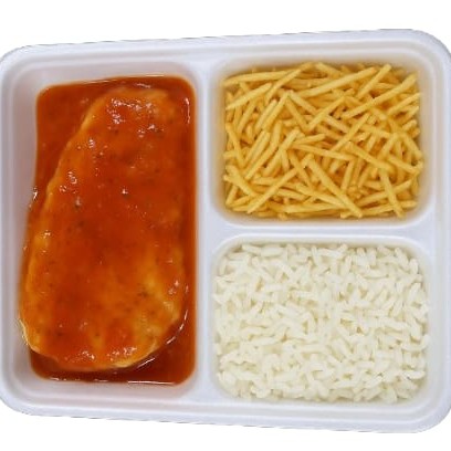 Marmita Executiva com Delicioso Filé de Frango parmegiana (empanado na massa cocrante, coberto com molho de tomates e queijo mussarela) acompanhado de arroz branco e batata palha (Marmita Indicada Para 01 Pessoa)