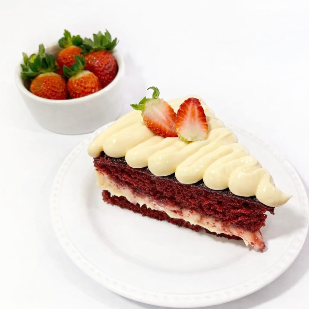 Deliciosa fatia de Red Velvet, com massa macia e levemente aveludada, recheio cremoso e cobertura suave. Um clássico elegante que conquista pelo sabor e pela textura única