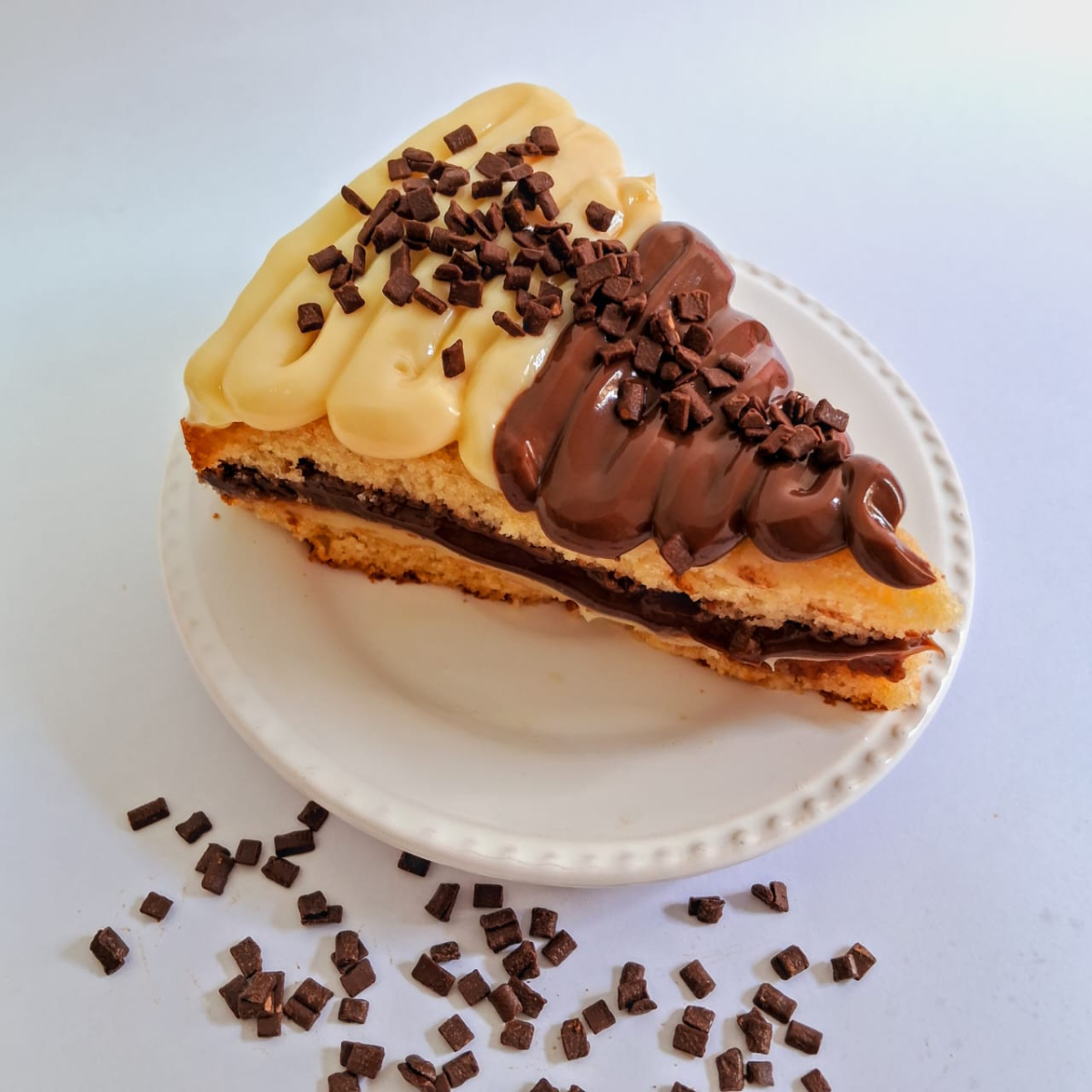 Deliciosa fatia de torta Dois Amores, feita com chocolate ao leite e chocolate branco, formando uma combinação cremosa e irresistível. Perfeita para quem ama o melhor dos dois mundos,