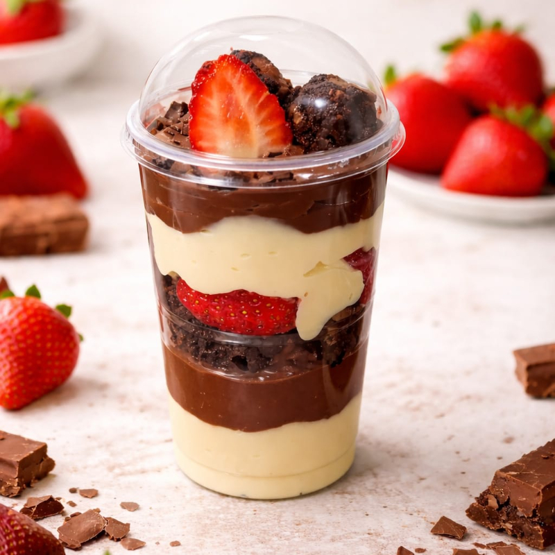 Camadas generosas de creme de Ninho super cremoso, chocolate intenso, pedaços de brownie macio e morangos fresquinhos que equilibram tudo na medida certa. Finalizado com granulé crocante por cima, trazendo aquele toque perfeito em cada colherada. Simples assim: felicidade em camadas, pronta pra viciar.