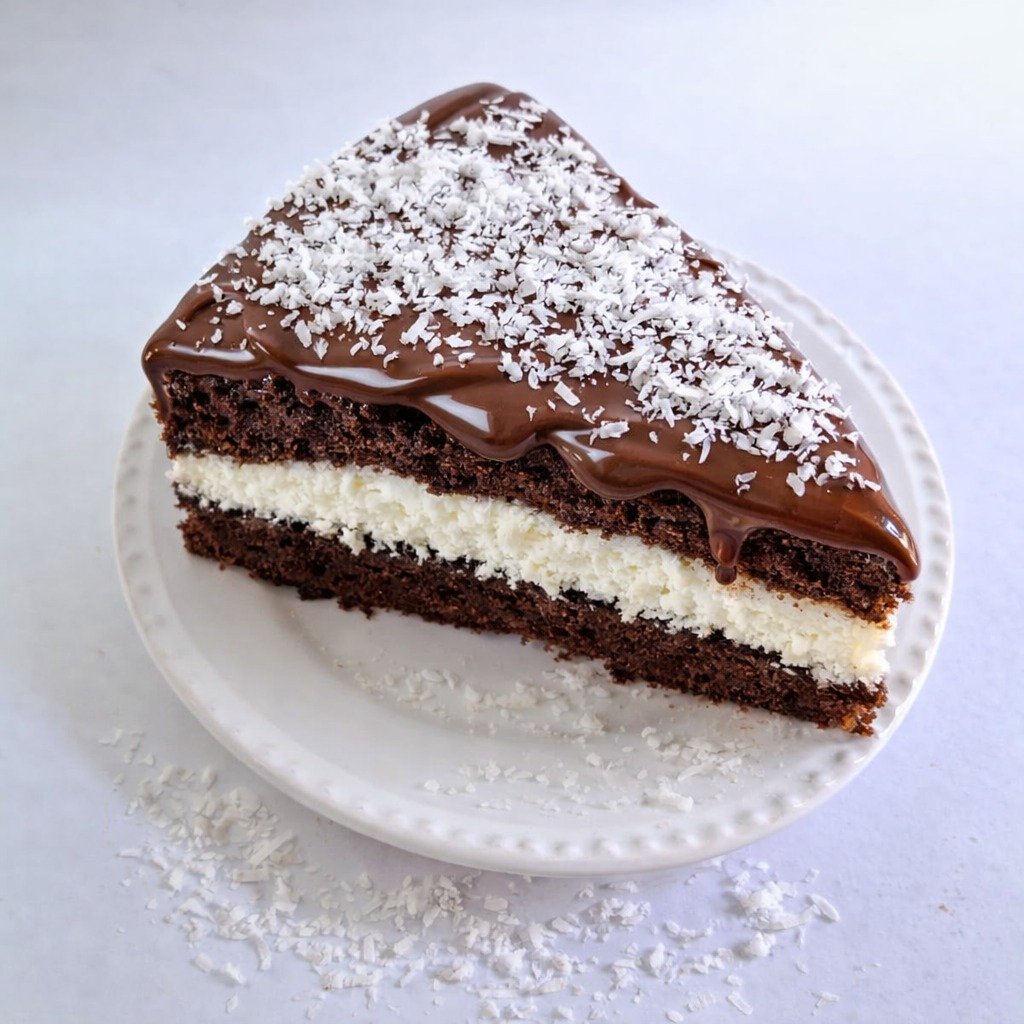 Deliciosa fatia de torta sabor Prestígio, feita com chocolate 50%, recheio cremoso de coco e cobertura generosa de chocolate. Uma explosão de sabor pra quem ama chocolate de verdade.