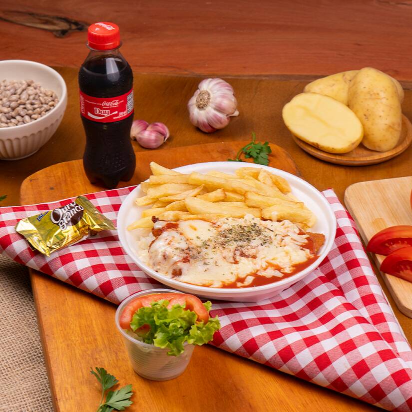 Nosso prato mais amado agora em combo! Parmegiana de Frango crocante + Coca-Cola gelada. Refeição completa, bem servida e com preço especial. Aproveite!”