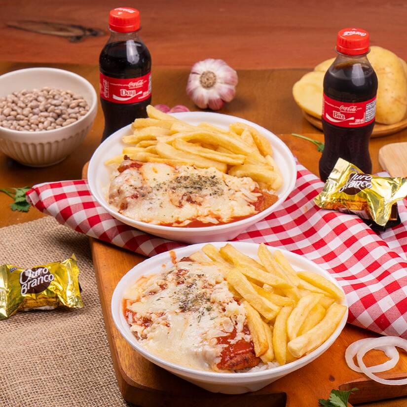O combo mais queridinho de todos acompanha : 2 marmitas de parmegiana de frango + 2 coca mini de 200ml e mais duas sobremesas podendo ser ( Mousse de Limão, maracujá, manga ou Brownie ou Trufa) !!