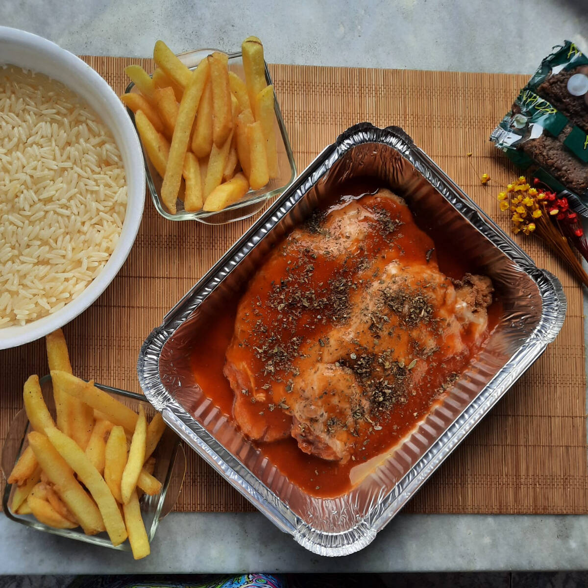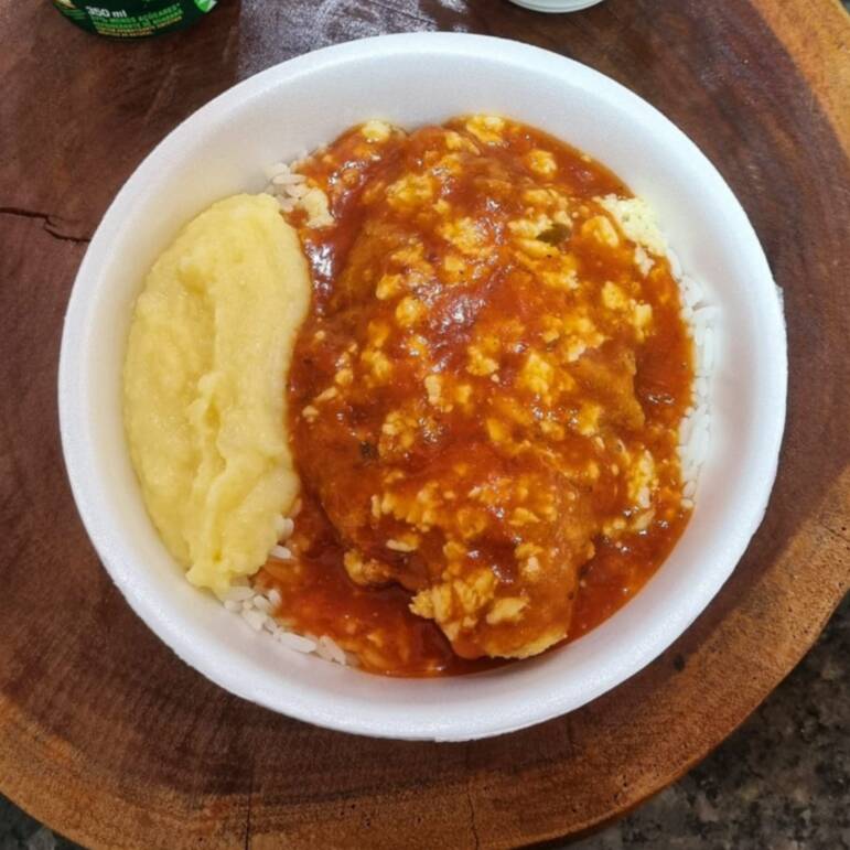 Filé de Frango, bem temperado e suculento feitos à milanesa, cobertos por uma camada de queijo e banhados por molho de tomate e uma pitada de orégano para finalizar. Escolha com quantas pessoas você quer dividir esse momento! → Campeão de Pedidos. Escolha entre Escolha entre arroz com purê ou batata frita /Macarrão com purê ou Batata Frita A comida de Casa que Mainha faz! Obs: -Embalagem Pt 102. -Ideal para duas ou três Pessoas Esperamos que você tenha uma ótima experiência com a gente. Foto Ilustrativa