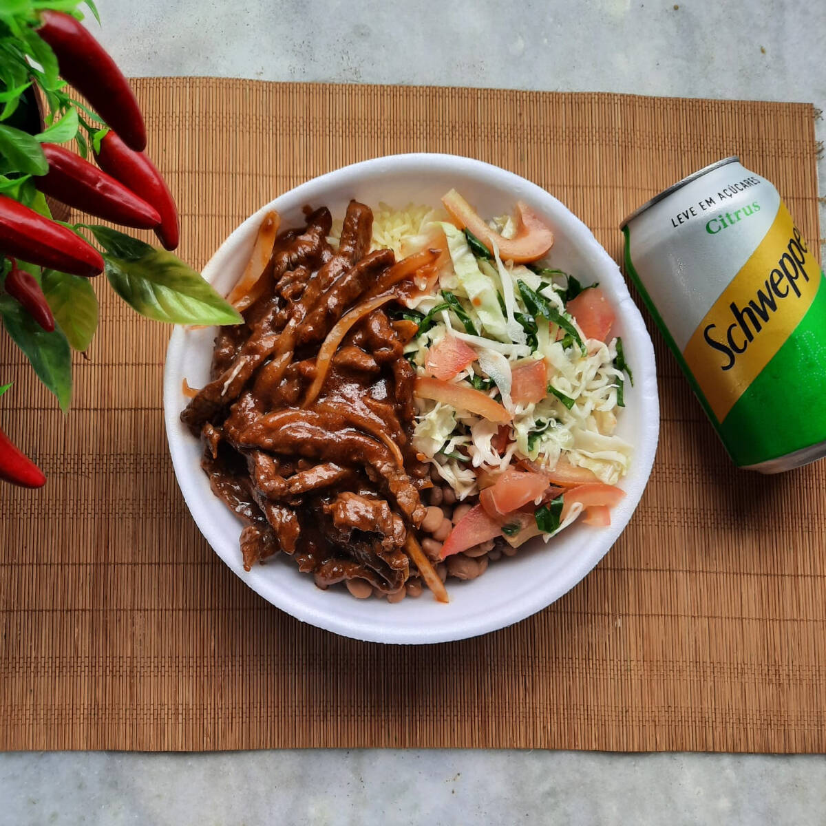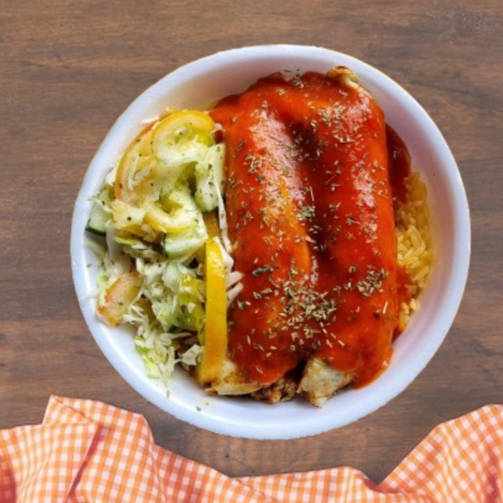 São duas unidades de uma fina massa a base de farinha de trigo, ovos, óleo, leite e queijo ralado; estruturada na frigideira; recheada com uma deliciosa carne moída temperada com especiarias, coberta com uma camada de molho de tomate e uma pitada de orégano! Escolha até 3 opções de acompanhamentos: Arroz, Feijão de Caldo, Macarrão e Salada. Obs: -Embalagem Pt 102. -Ideal para uma pessoa. Esperamos que você tenha uma ótima experiência com a gente. Foto Real