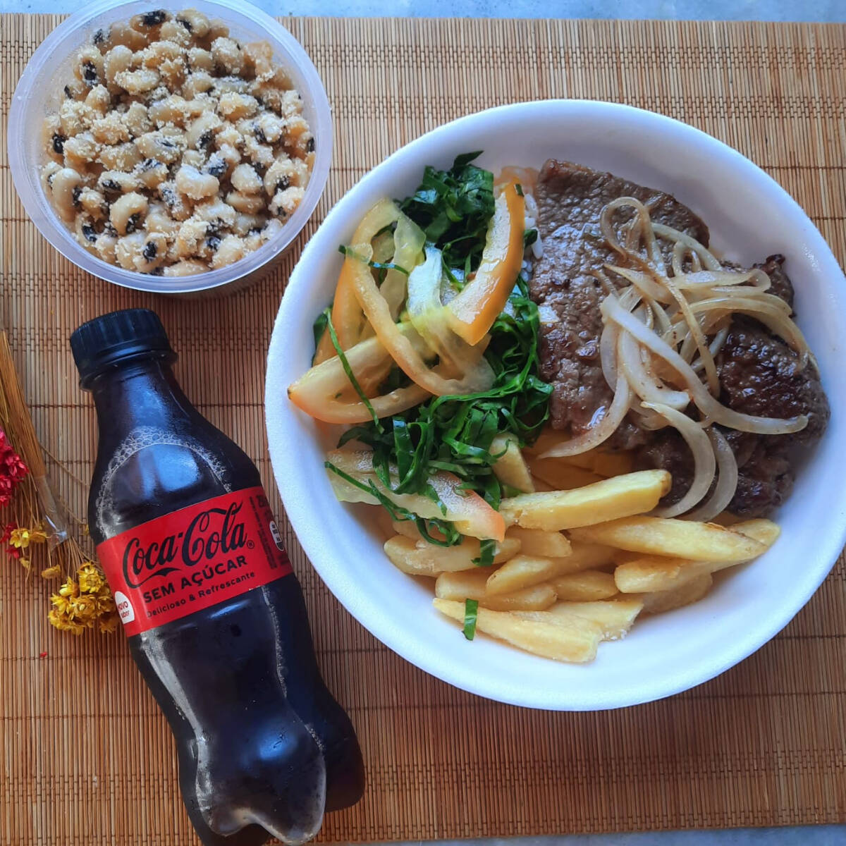 Suculento Bife de primeira, sem nervos e gordura, temperado com especiarias e selado no chapa, com batata frita e sequinha. Escolha até 3 opções de acompanhamentos: Arroz, Feijão de Caldo, Feijão Tropeiro, Macarrão e Salada. Obs: -Embalagem Pt 102. -Ideal para uma pessoa. Esperamos que você tenha uma ótima experiência com a gente. Foto Real