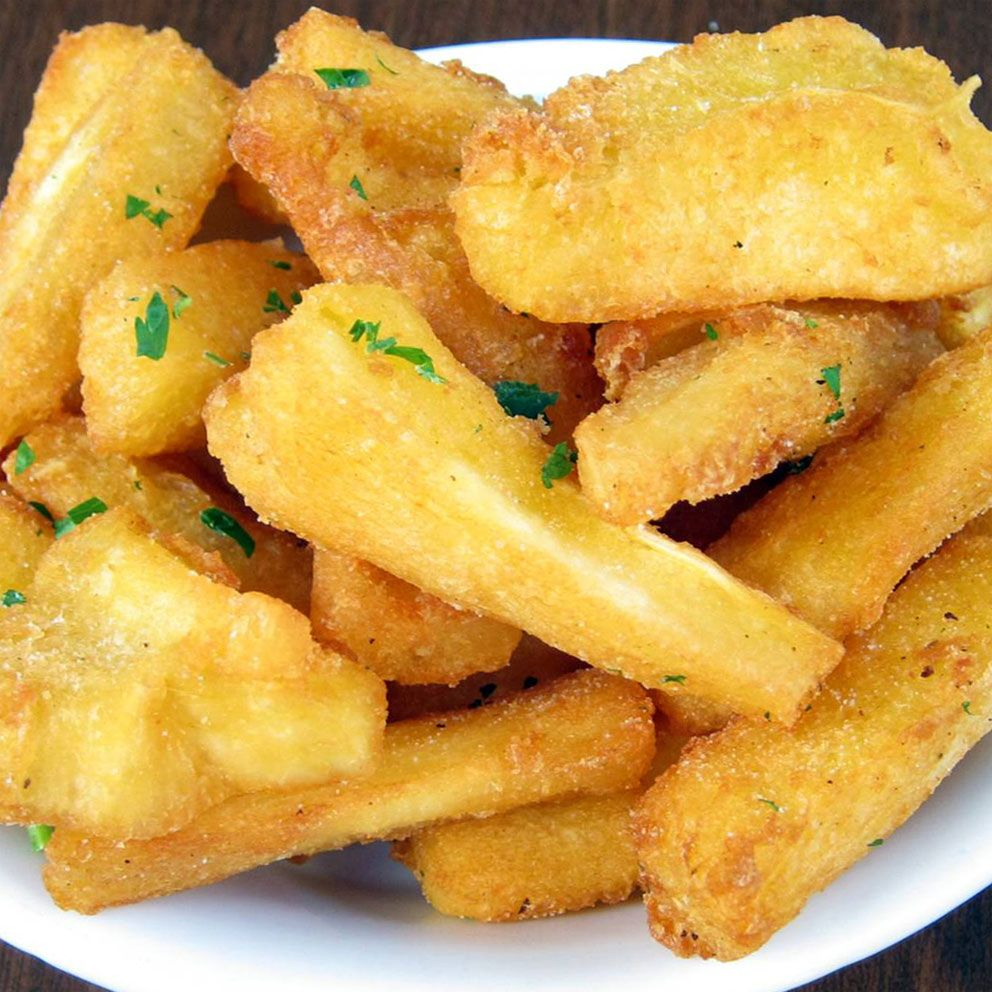 Tiras de aipim cozido e frito, resultando em um aperitivo levemente crocante por fora e macio por dentro!