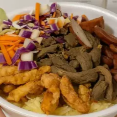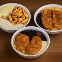 Arroz, tropeiro, aipim na manteiga e misto de proteína(iscas de frango, carne e calabresa acebolada na chapa)