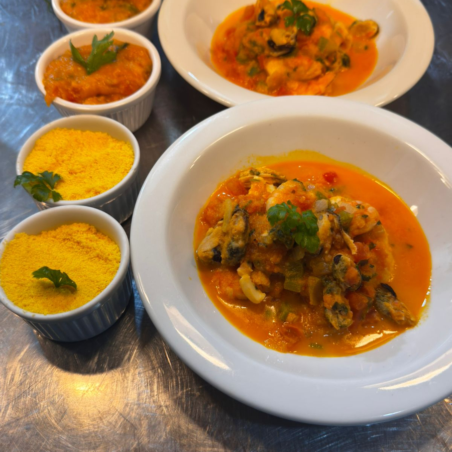 (camarão, lula, mexilhão, peixe) com arroz, pirão e farofa