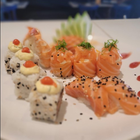 2 sashimi de salmão, 3 niguiri de salmão, 2 uramaki de salmão cru, 2 hossomaki de salmão cru, 3 batera, 2 philadelphia light
