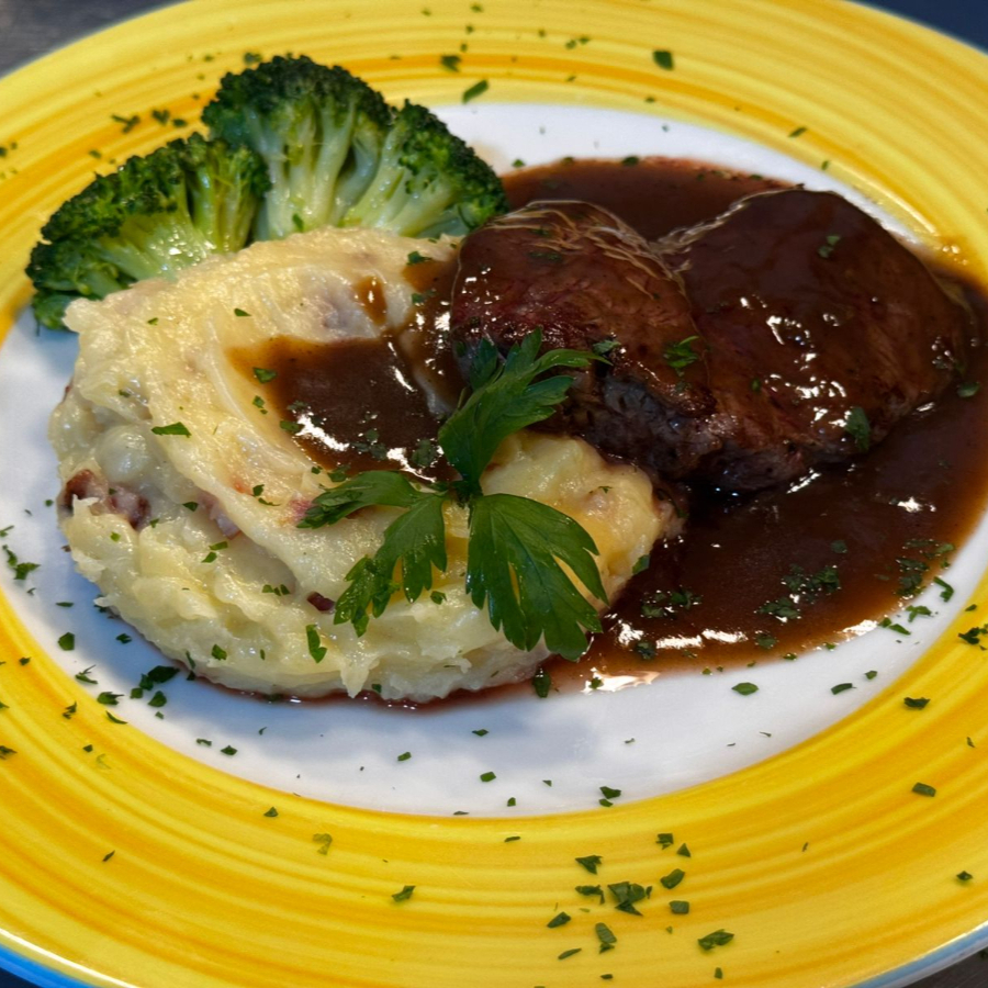 Filet Mignon Grelhado Ao Molho Escuro Com Purê De Batata Rústica E Pedacinhos De Bacon Crocante E Brócolis