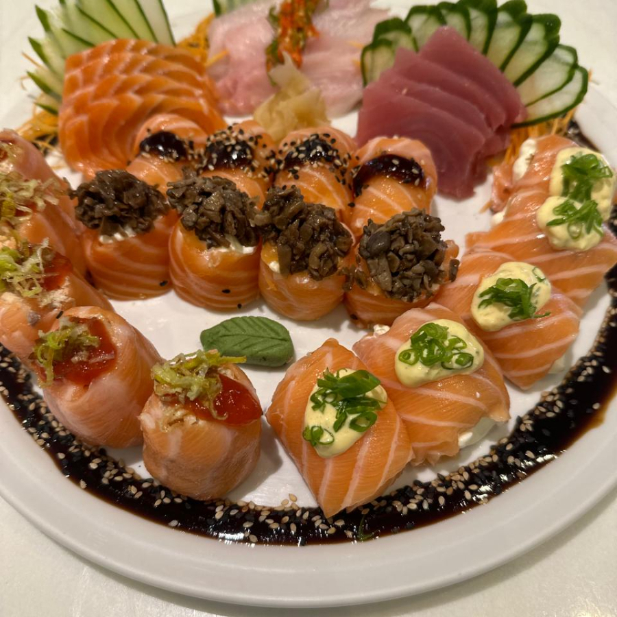 Combinado 30 Peças Premium (5 sashimis de salmão, 4 sashimis de atum, 4 sashimis de peixe branco, 4 ebitem especial cru, 4 ebijoe, 4 joe shimeji, hot furai maçaricado.)