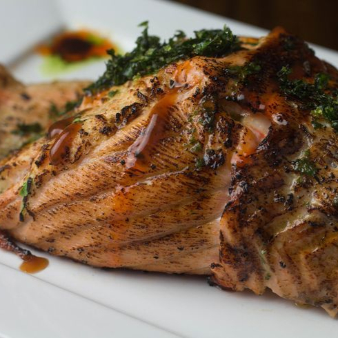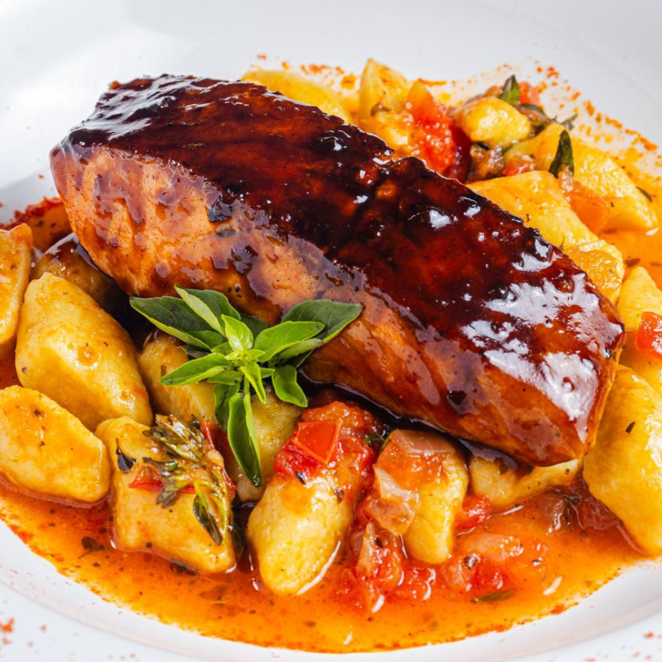Salmão Grelhado Com Tarê E Nhoque De Banana Da Terra Ao Pomodoro
