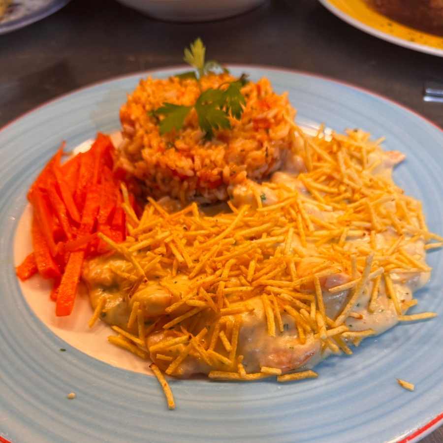 Camarão Ao Molho De Queijo C Arroz Ao Pomodoro E Manjericão, Cenoura Julienne E Batata Palha