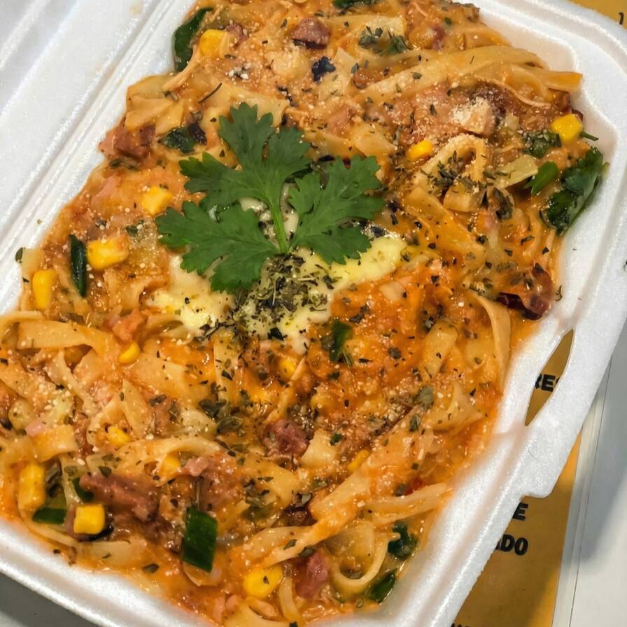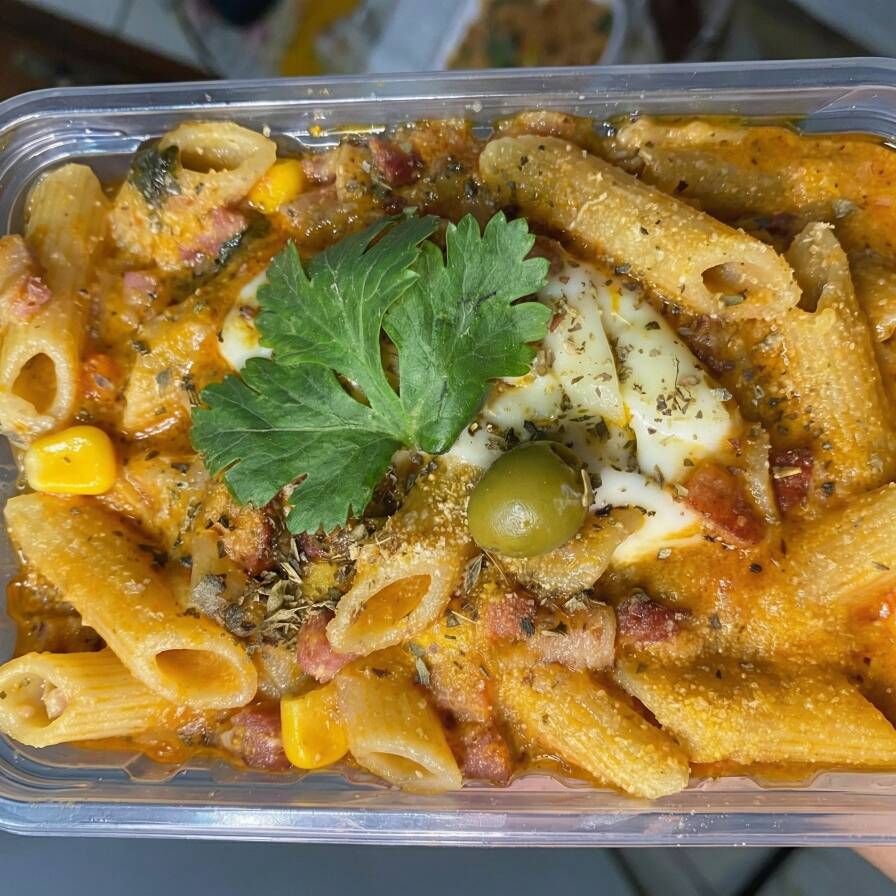 Macarrão feito na hora, super recheado com bacon, calabresa, frango, milho, ervilha, azeitonas, uva-passas, temperado com alho, cebola, cheiro-verde, orégano e pimenta calabresa, finalizado com muito queijo ralado e mussarela derretendo por cima.