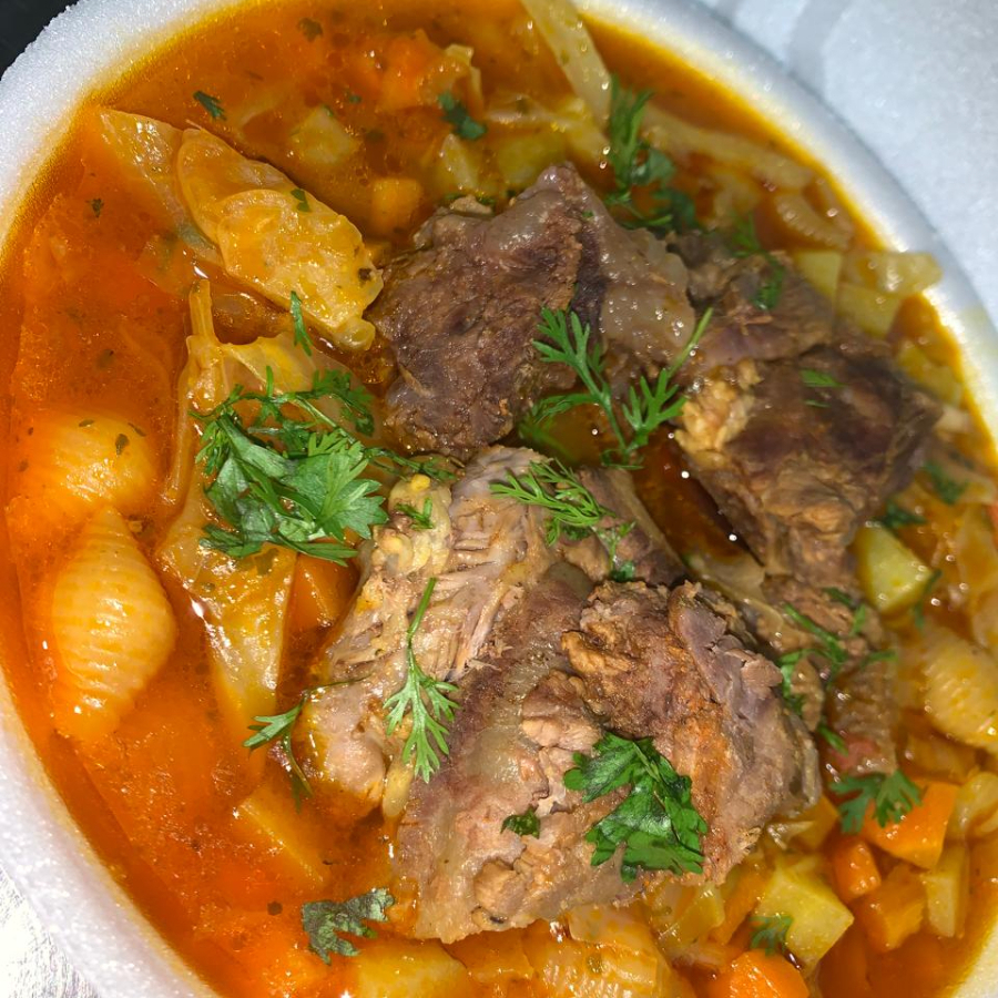 Osso com carne, batata ,cenoura, chuchu, repolho , massa de concha, preparo feito com temperos especiais naturais