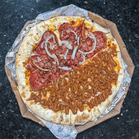 Mussarela, Calabresa, Tomate, Cebola, Cheddar e Orégano