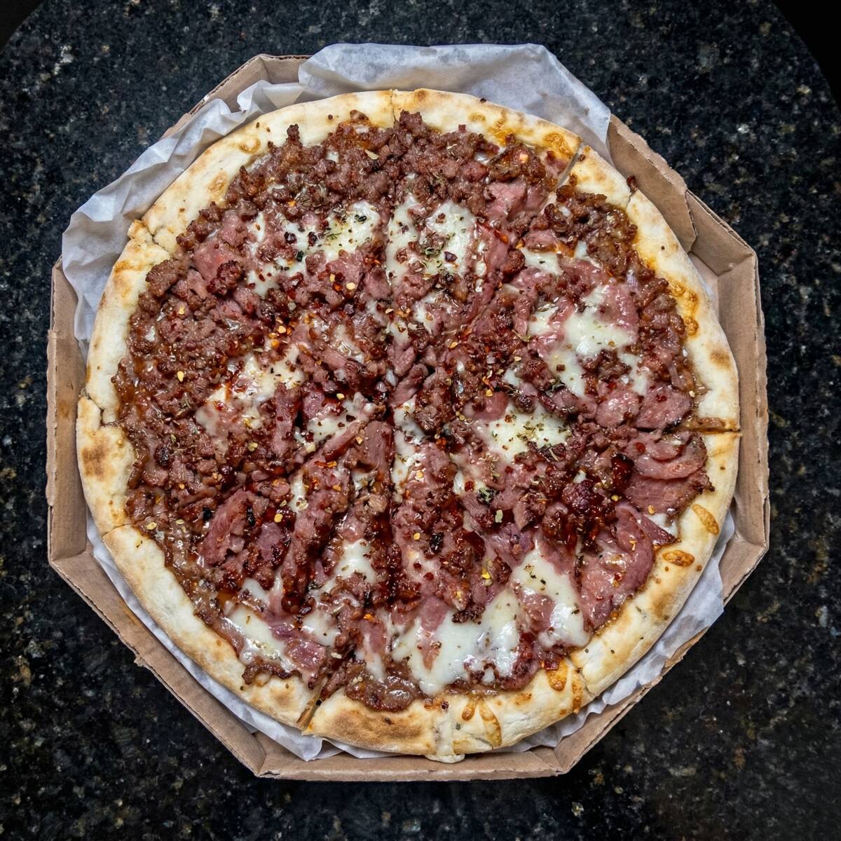 Mussarela, Calabresa Triturada, Pimenta Calabresa e Orégano