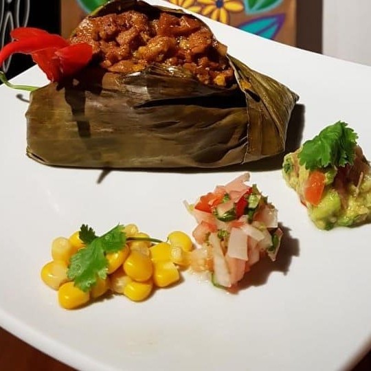 Deliciosa trouxinha de milho cozida na folha de bananeira, recheada com frango mexicano suavemente picante.