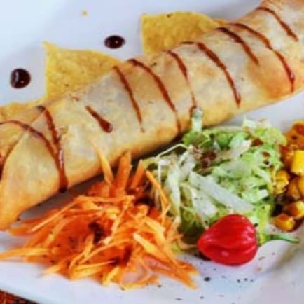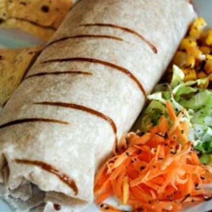Deliciosa tortilla de trigo assada recheada com feijão refrito mexicano, arroz mexicano, queijo mussarela, acelga e proteína a escolha