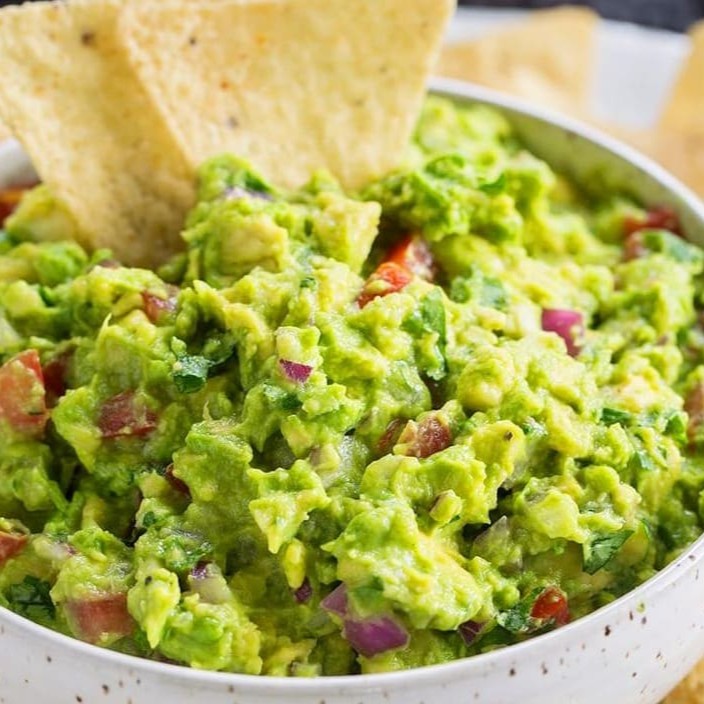 Deliciosa salada de abacate suavemente picante, acompanha totopos.