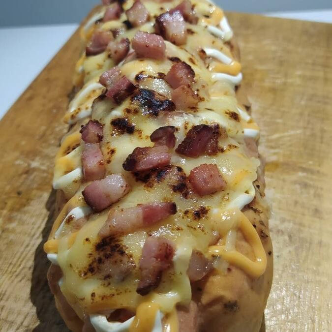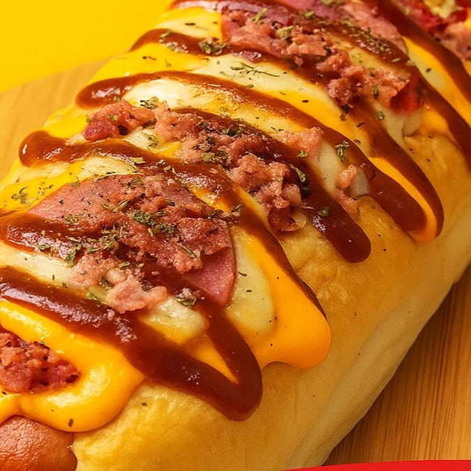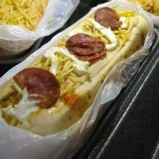 Dogão no Pão Tradicional 20cm, 2 Salsichas, Molho secreto da Casa, bacon crocante,Calabresa defumada em Rodelas, dupla camada de cheddar, mussarela maçaricada e Batata Palha crocante!