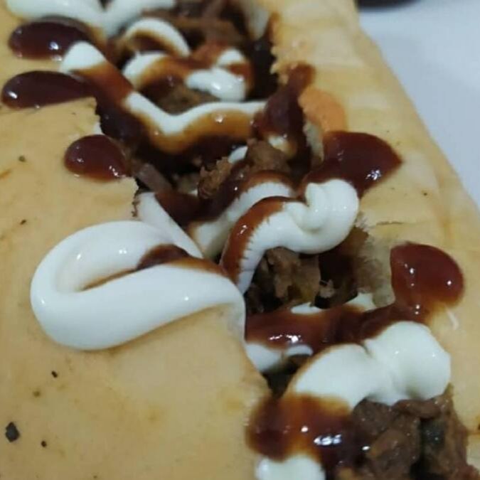 Doguinho 15cm, 1 salsicha, molho gourmet da casa, molho barbecue, carne de panela desfiada, cream cheese, mussarela maçaricada e batata palha.