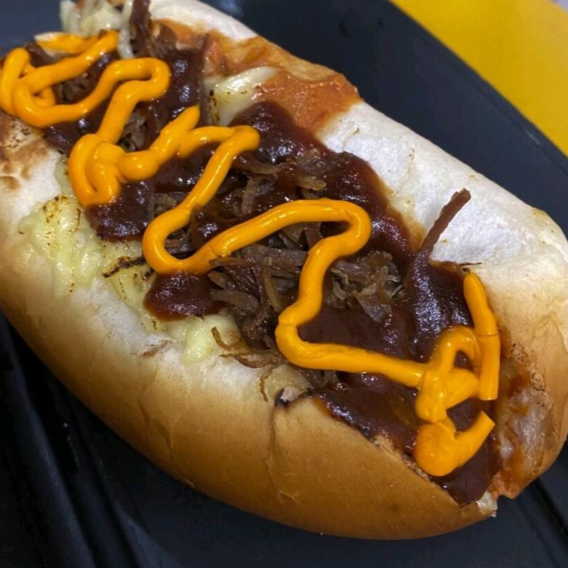 Dogão no Pão tradicional 20cm, 2 Salsichas, Molho secreto Da Casa, Delicioso Molho Barbecue Defumado, Carne de panela Desfiada, Cream Cheese, Mussarela Maçaricada e Batata Palha Crocante!