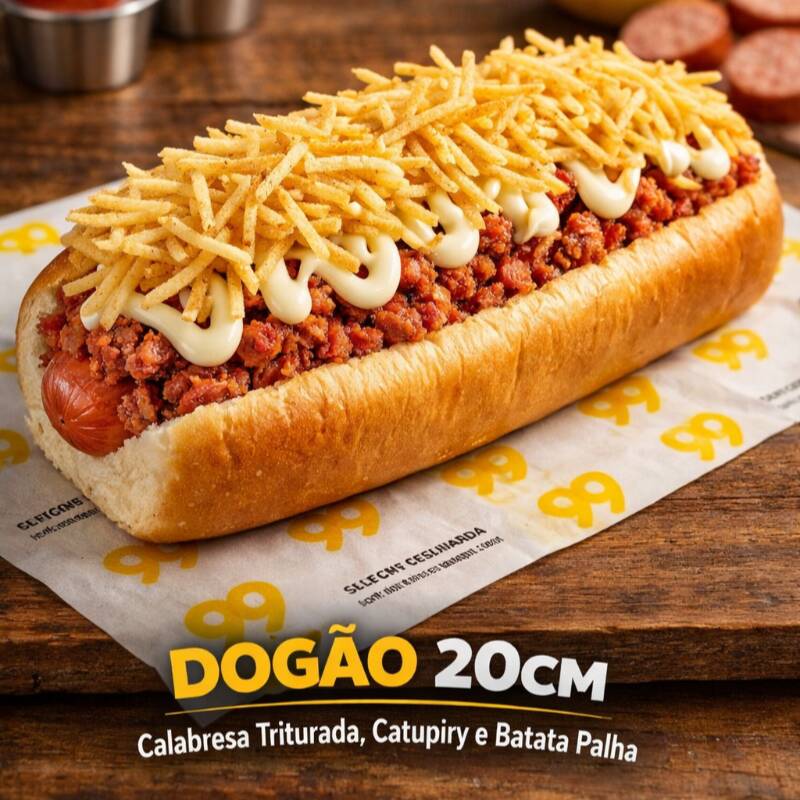 Dogão no Pão Tradicional 20cm, 2 Salsichas, Molho secreto da Casa, Mussarela Maçaricada, Requeijão Catupiry, Cheddar, Calabresa defumada em Rodelas e batata palha crocante!