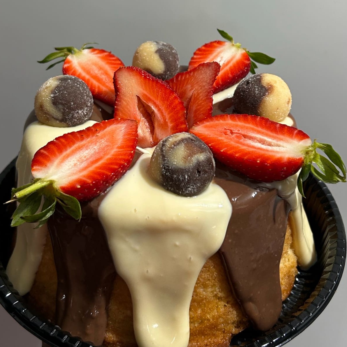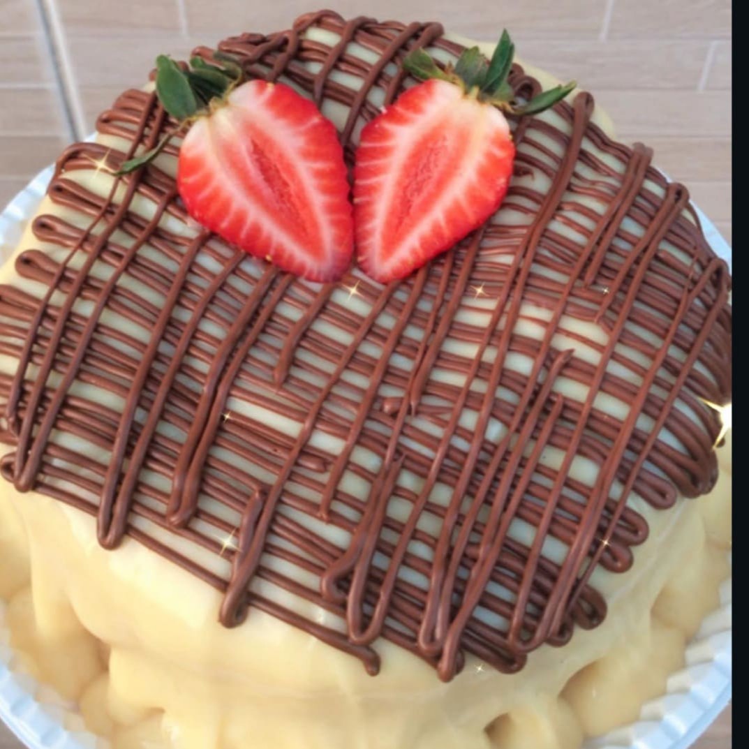 Massa amanteigada , bem fofinha, molhadinha com cobertura de brigadeiro gourmet ao leite e brigadeiro gourmet branco,decorado com Casadinhos e morango fresco. Serve até 8 pessoasassa