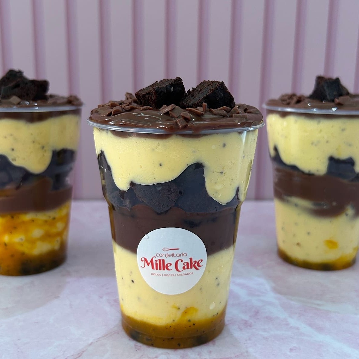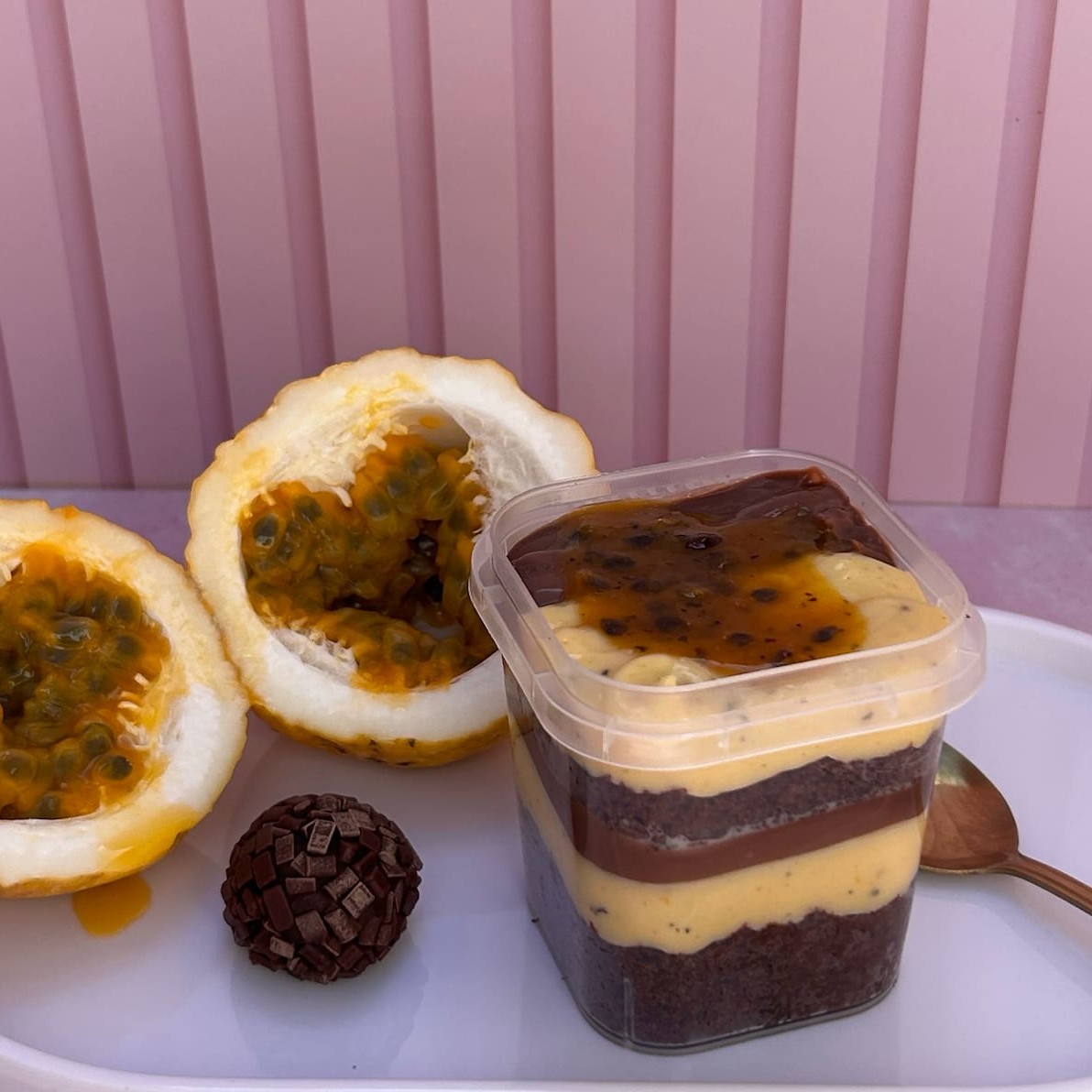 Massa fofinha, molhadinho de chocolate com recheio suculento de brigadeiro gourmet e brigadeiro gourmet de maracujá , finalizado com geleia artesanal de maracujá .