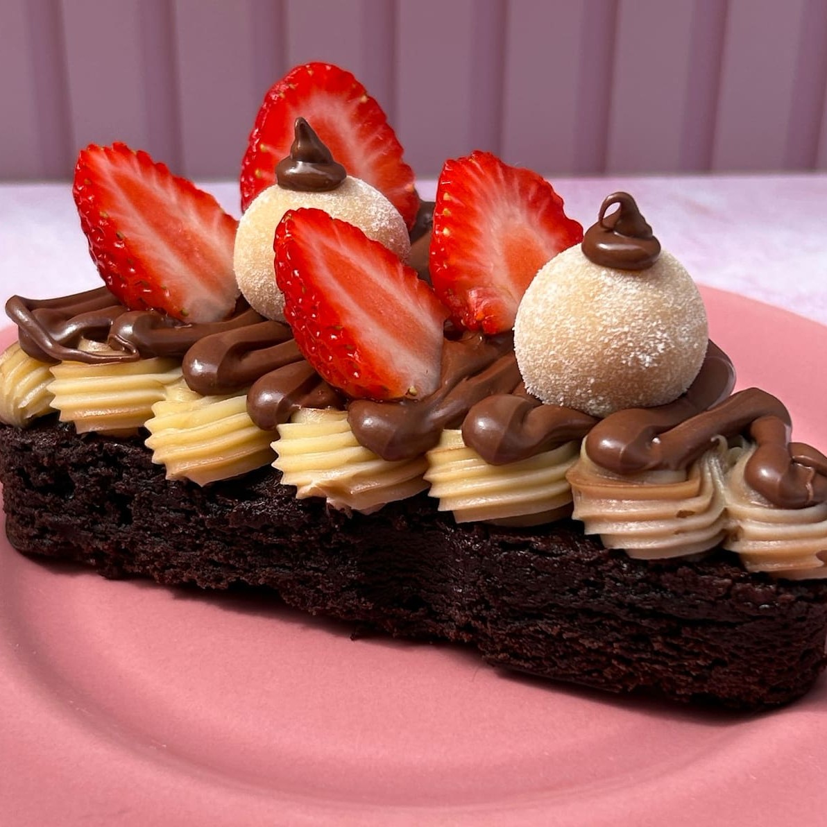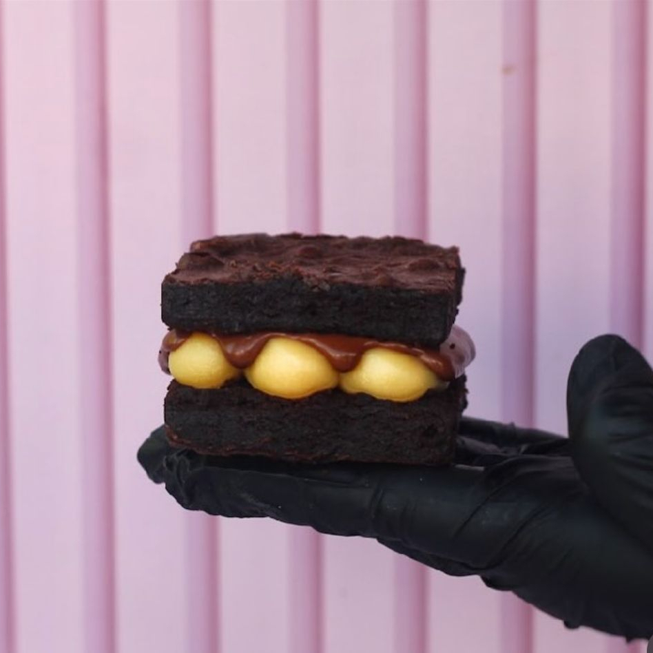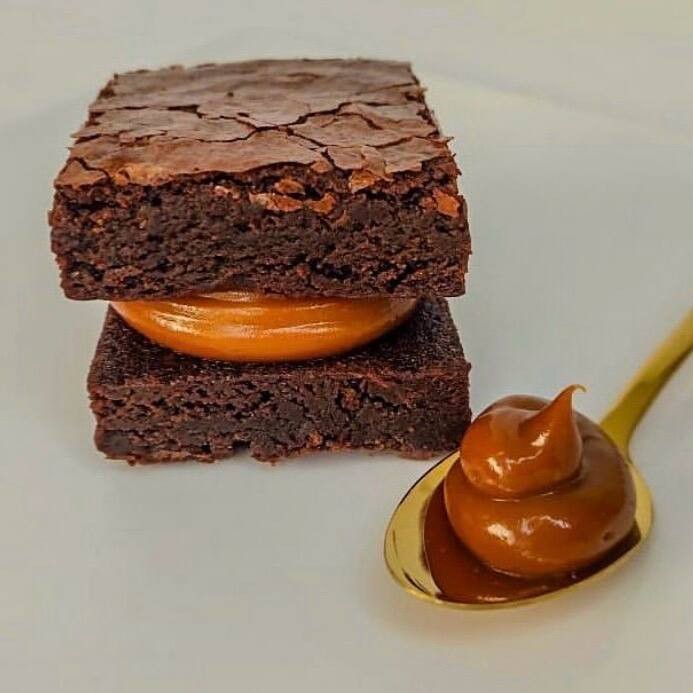 Brownie molhadinho com casquinha crocante, recheado com brigadeiro de ninho e nutella.